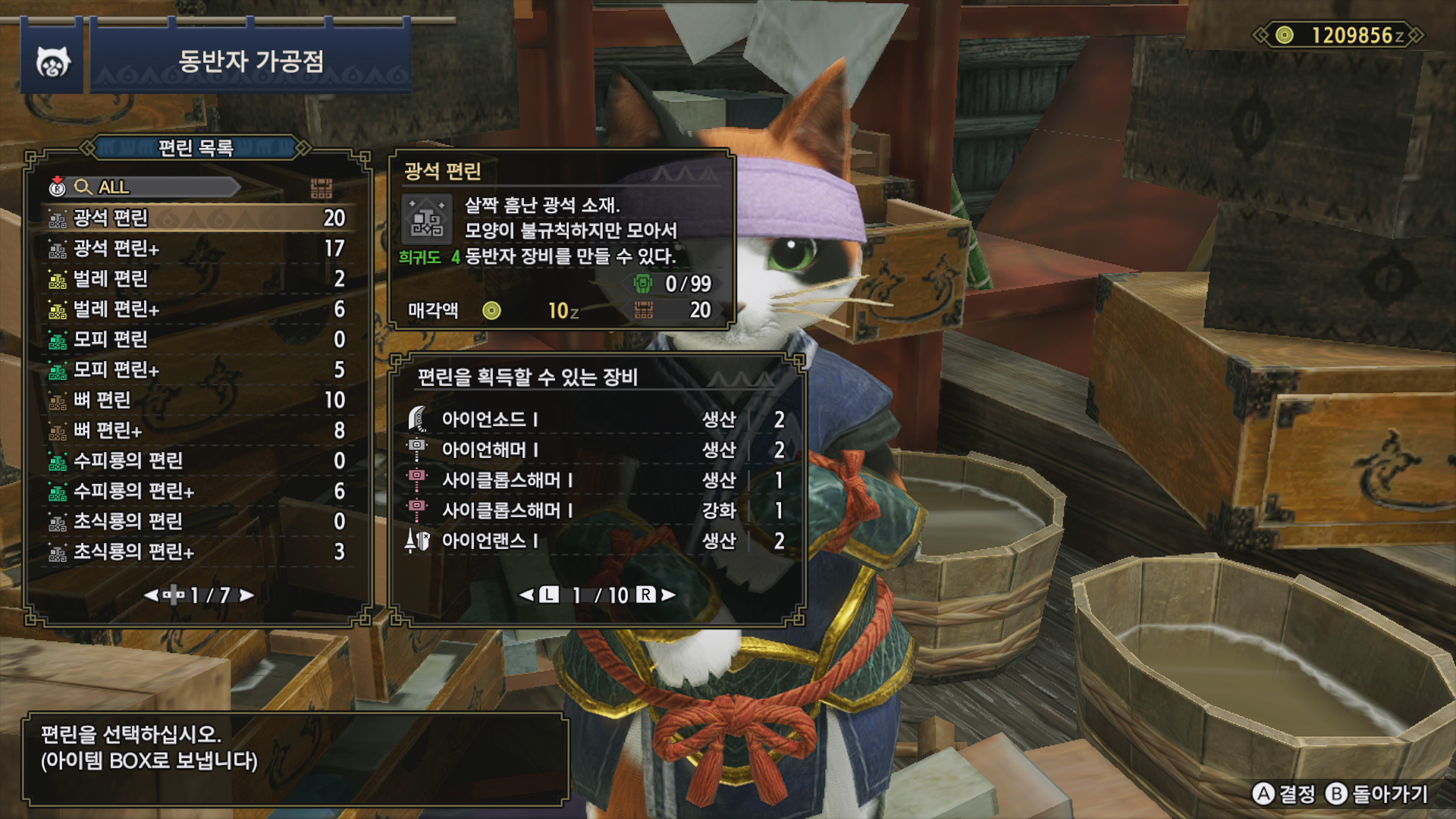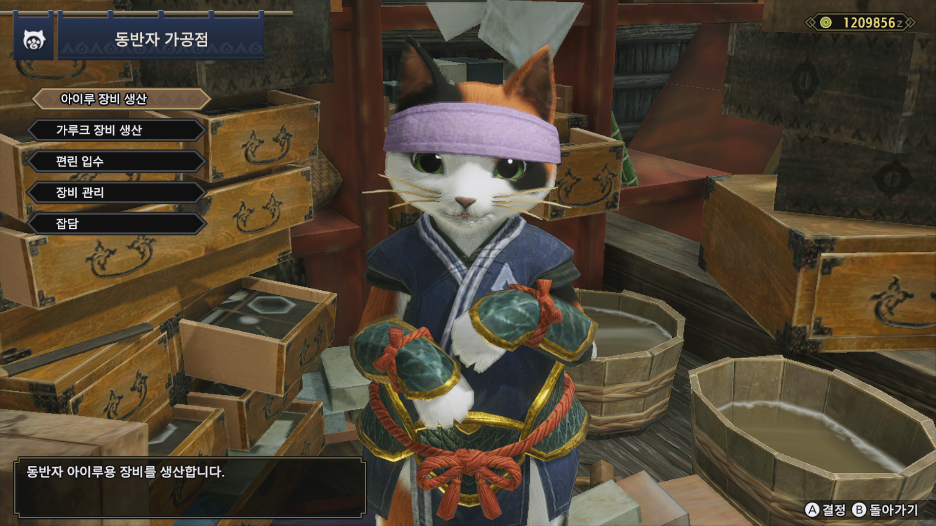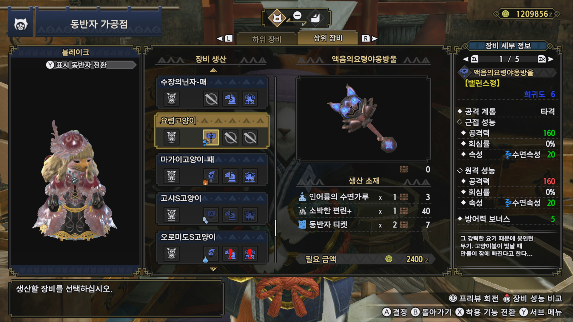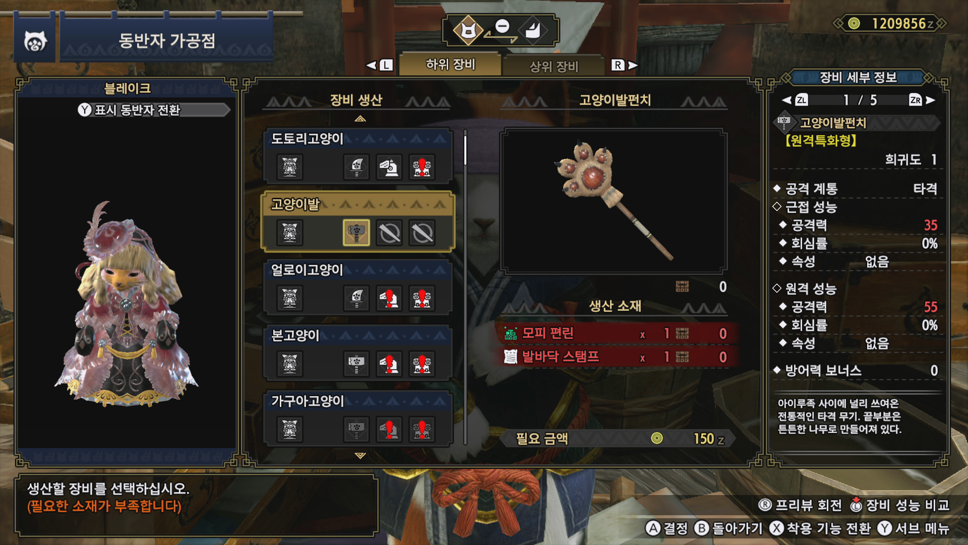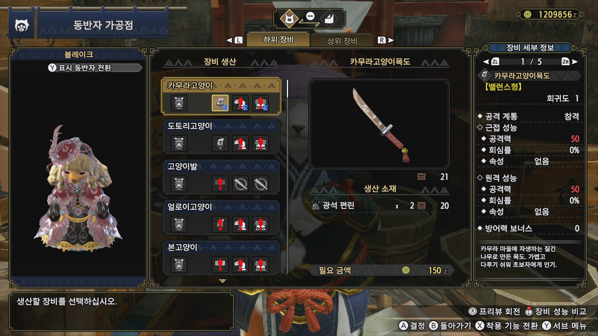 동반자도 헌터와 마찬가지로 장비를 착용할 수 있으며 무기, 모자, 옷의 세 부위에 장비할 수 있습니다