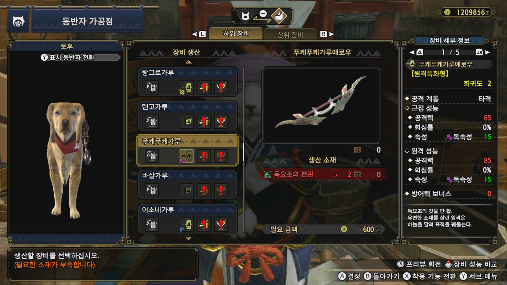 조금 더 진행하여 독요조 푸케푸케를 만나게 되면 독속성 15인 무기도 제작할 수 있습니다